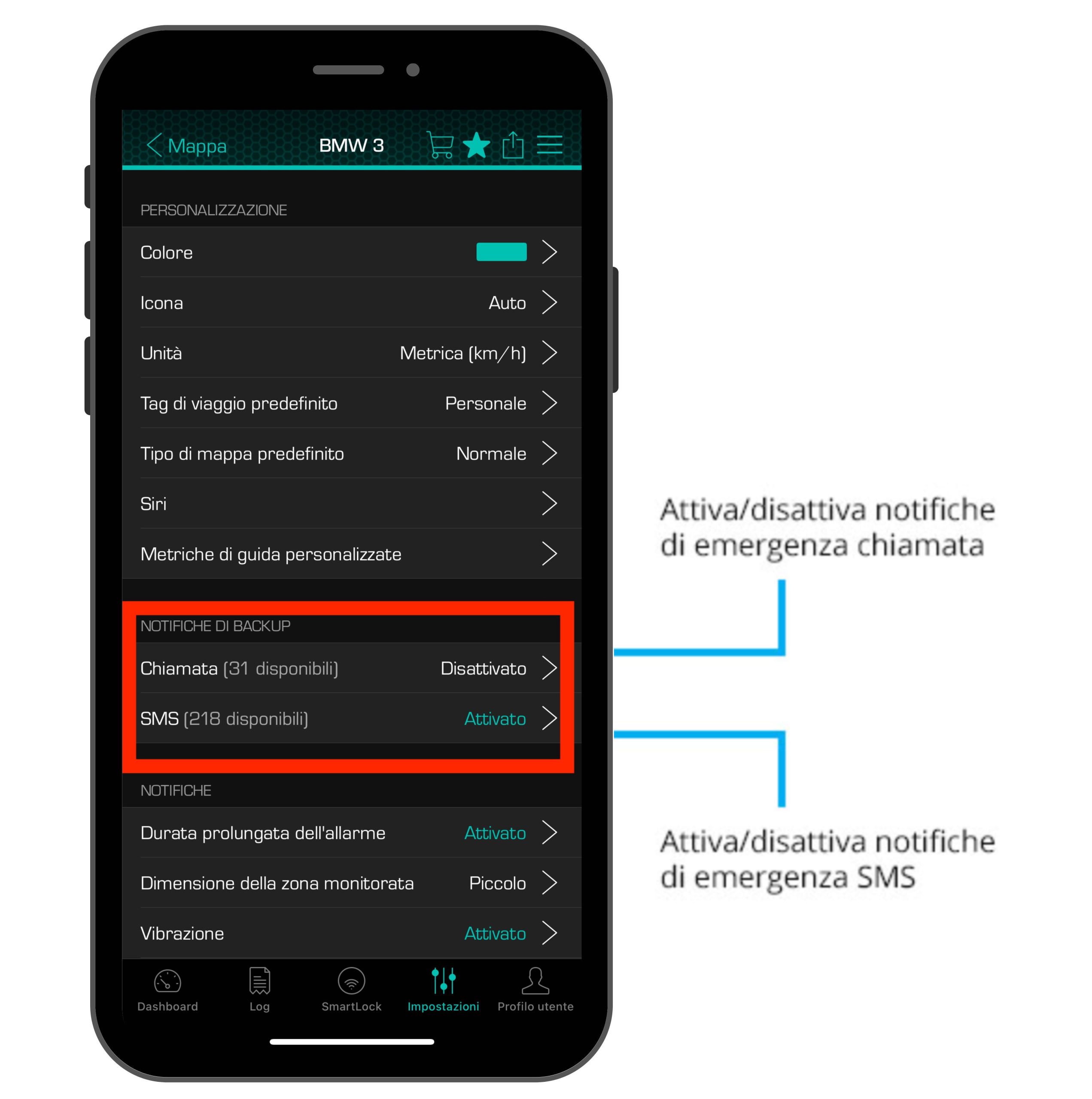 Nonostante il sistema CarLock utilizzi delle notifiche push per informarti, hai la possibilità di aggiungere SMS o chiamate di emergenza per essere informato anche quando la connessione dati del tuo telefono non è delle migliori o quando non vuoi pagare costi di roaming quando sei in viaggio.